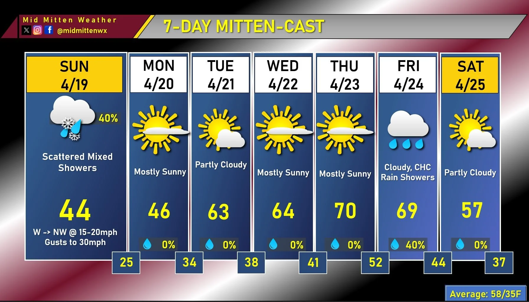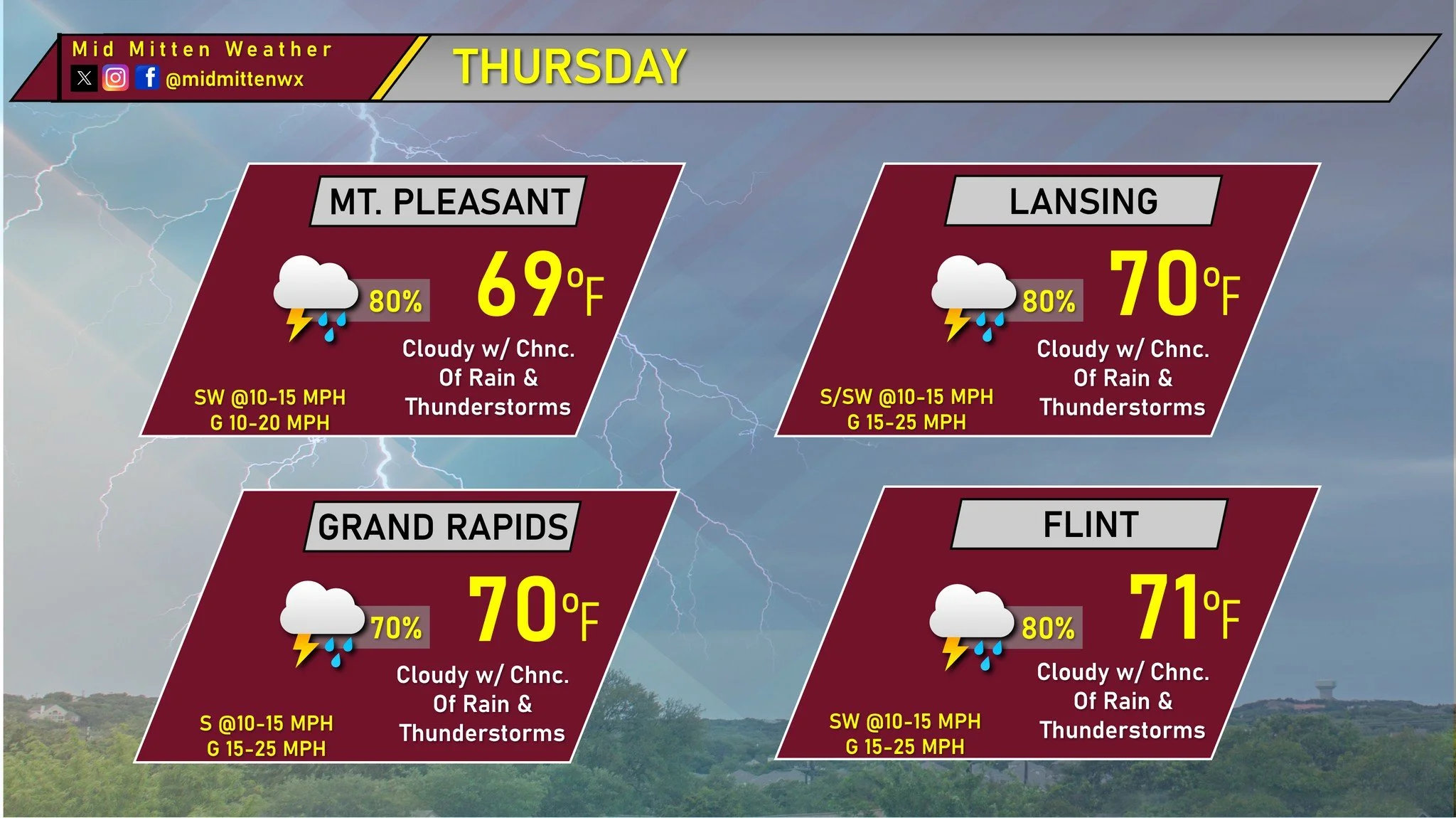 Tomorrow, the rain and storms will continue but with less severity. Again, gusty winds are expected for areas surrounded by the I-96 Corridor. Highs are expected to be around 70 degrees for most areas.